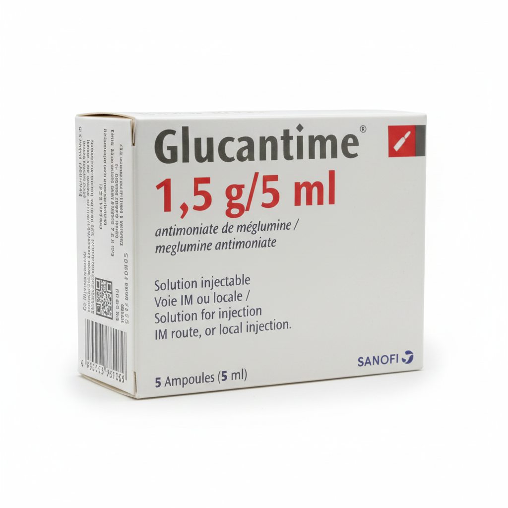 Glucantime is a medication used to treat leishmaniasis, an infection caused by tiny, one-celled organisms called protozoa. The medicine in the image contains meglumine antimoniate (1.5 g/5 ml) and is administered via intramuscular (IM) or local injection.